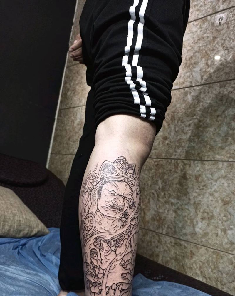 当前位置: 首页 >安徽省阜阳市纹身店-龍門刺青工作室纹身图案>黄财神线条纹身图片_腿部新传统黄财神纹身图案