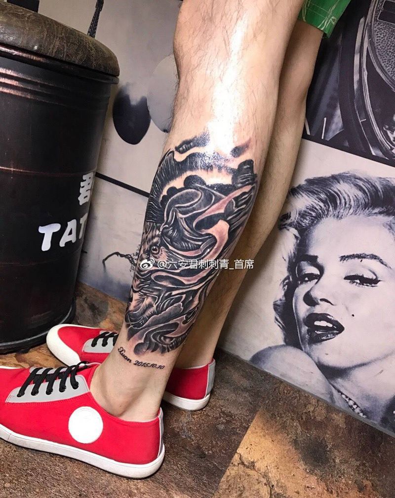 • T网红王老大花腿龙纹身图片_腿部新传统纹身图案