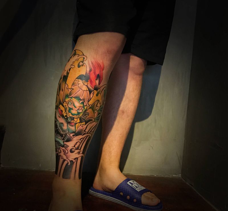 • T网红王老大花腿龙纹身图片_腿部新传统纹身图案