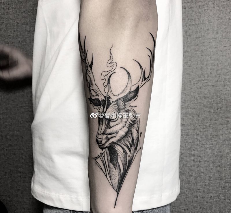 当前位置: 首页 >安徽省宿州市纹身店-宿州梓墨刺青纹身图案>鹿纹身图片_手臂几何点刺纹身图案