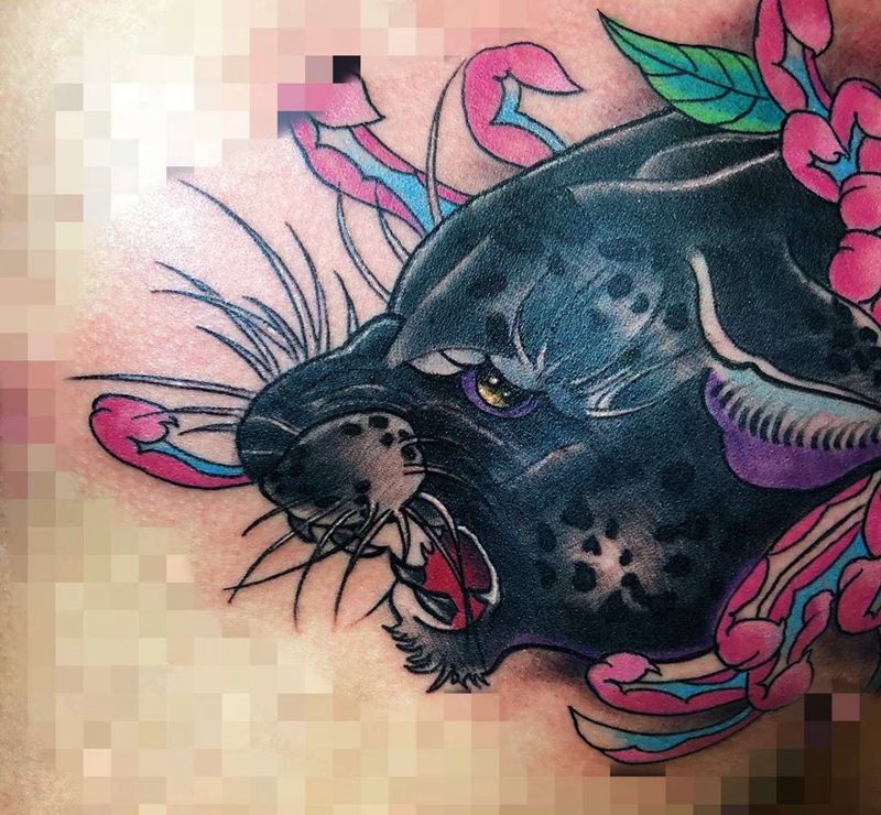 当前位置: 首页 >安徽省六安市纹身店-本格刺青工作室纹身图案>豹子 菊花纹身图片