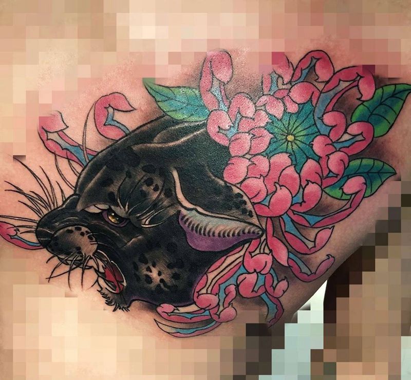 当前位置: 首页 >安徽省六安市纹身店-本格刺青工作室纹身图案>豹子 菊花纹身图片