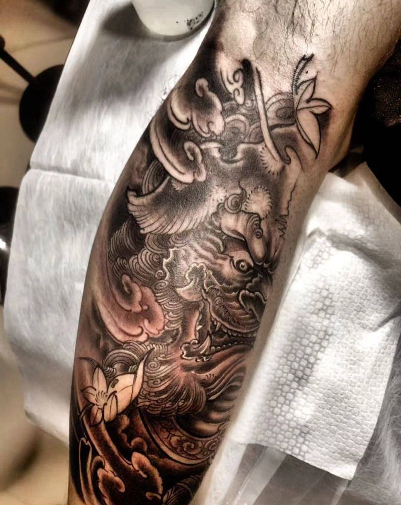 • T网红王老大花腿龙纹身图片_腿部新传统纹身图案
