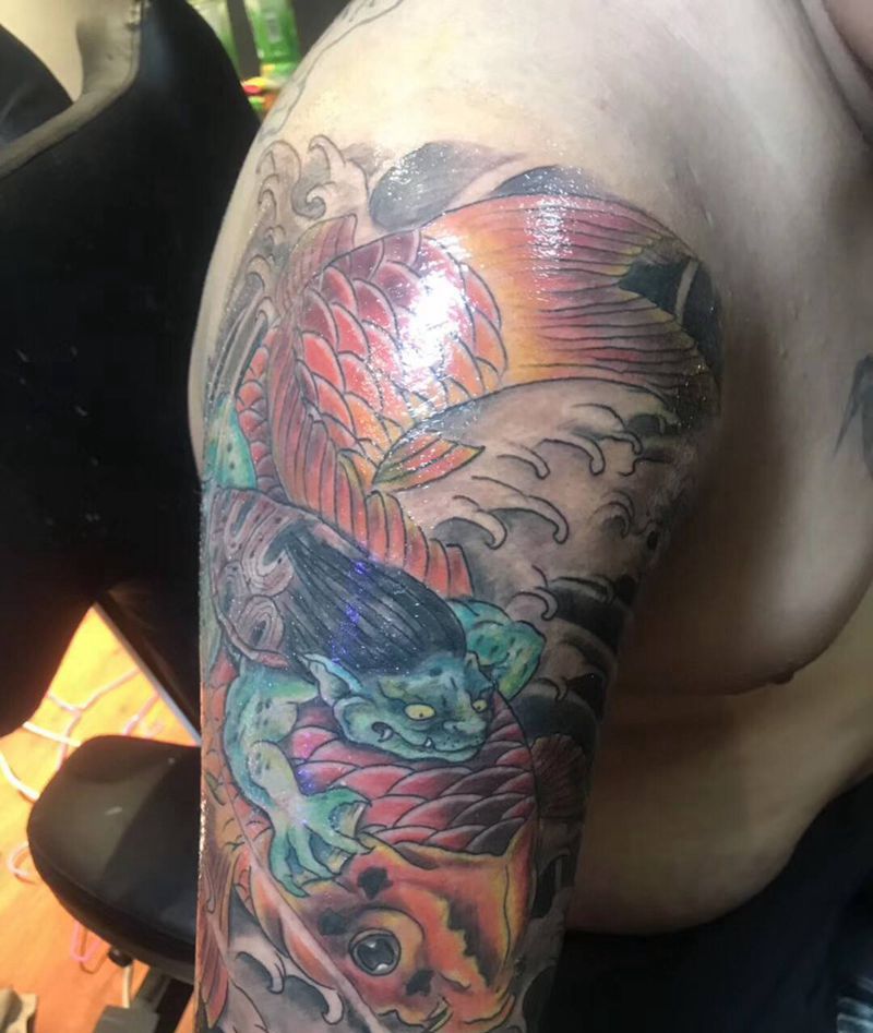 当前位置: 首页 >安徽省宿州市纹身店-The 7s Tattoo纹身图案>河童鲤鱼纹身图片_肩部手臂新传统鲤鱼河童纹身图案