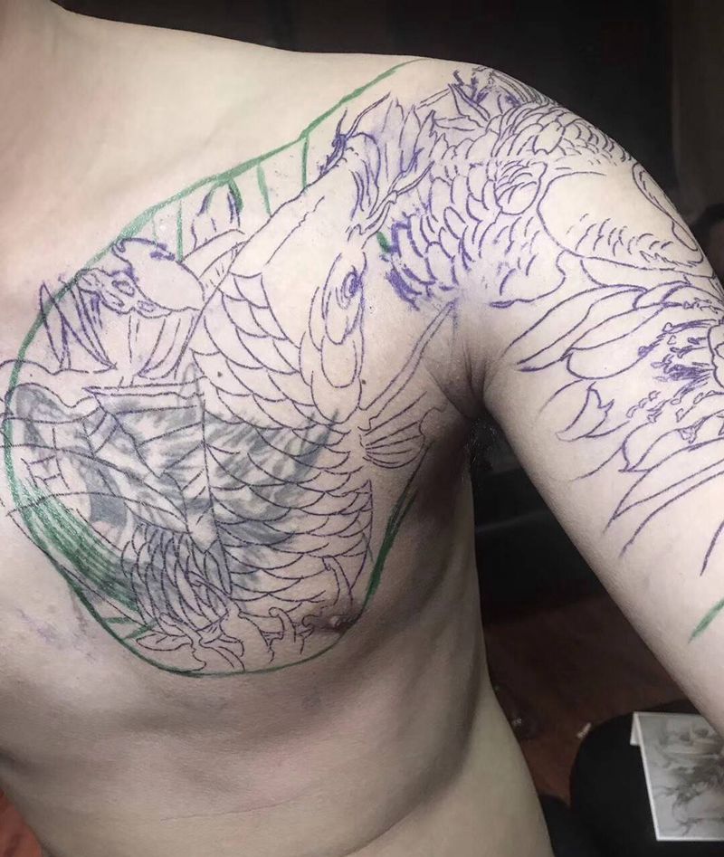 当前位置: 首页 >安徽省宿州市纹身店-The 7s Tattoo纹身图案>鲤鱼 仙鹤半胛纹身图片_胸部肩部新传统鲤鱼仙鹤纹身图案