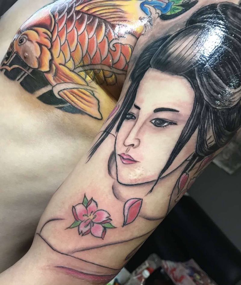 鲤鱼 艺伎半胛 遮盖纹身图片_胸部手臂新传统鲤鱼艺伎遮盖纹身图案