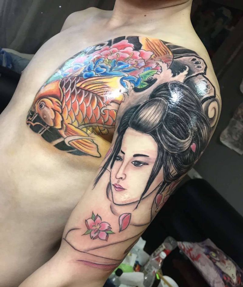 鲤鱼 艺伎半胛 遮盖纹身图片_胸部手臂新传统鲤鱼艺伎遮盖纹身图案