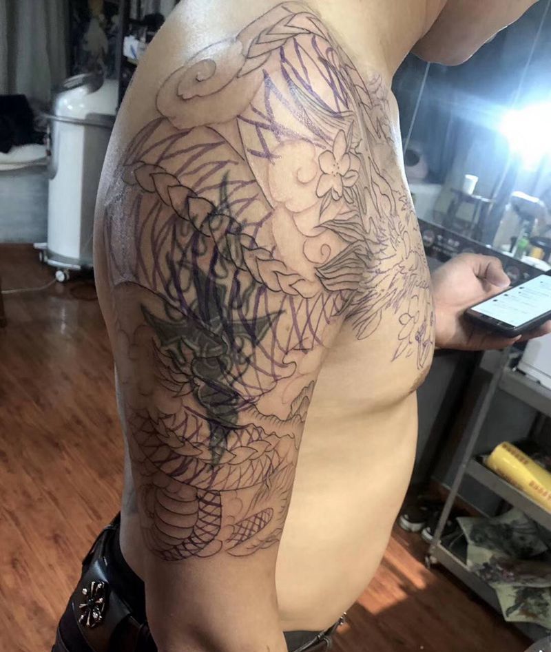 当前位置: 首页 >安徽省宿州市纹身店-The 7s Tattoo纹身图案>半胛龙 遮盖老纹身纹身图片_胸部手臂老传统新传统纹身图案