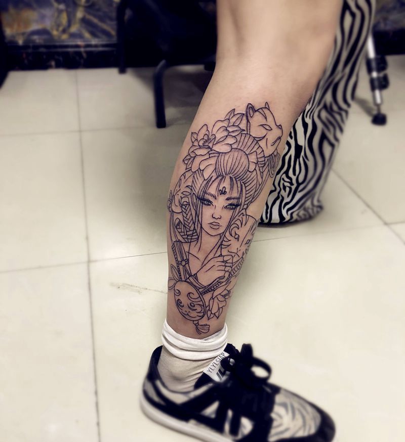 当前位置: 首页 >安徽省亳州市纹身店-鬼谷刺青工作室纹身图案>艺妓线条纹身图片_新传统纹身图案