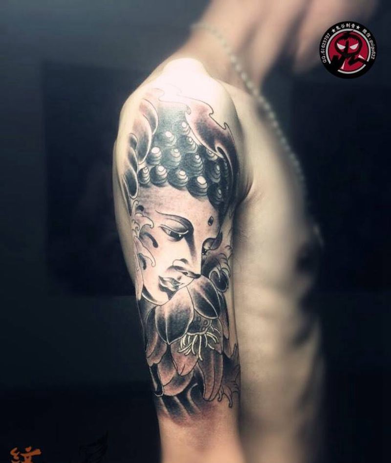 安庆小伙的大臂佛纹身图片_成品手臂传统宗教纹身图案