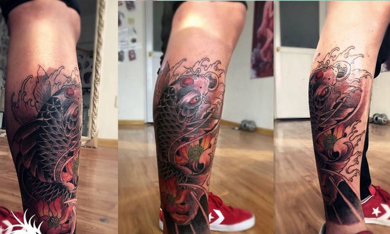 当前位置: 首页 >安徽省亳州市纹身店-鬼谷刺青工作室纹身图案>小腿鲤鱼完活纹身图片