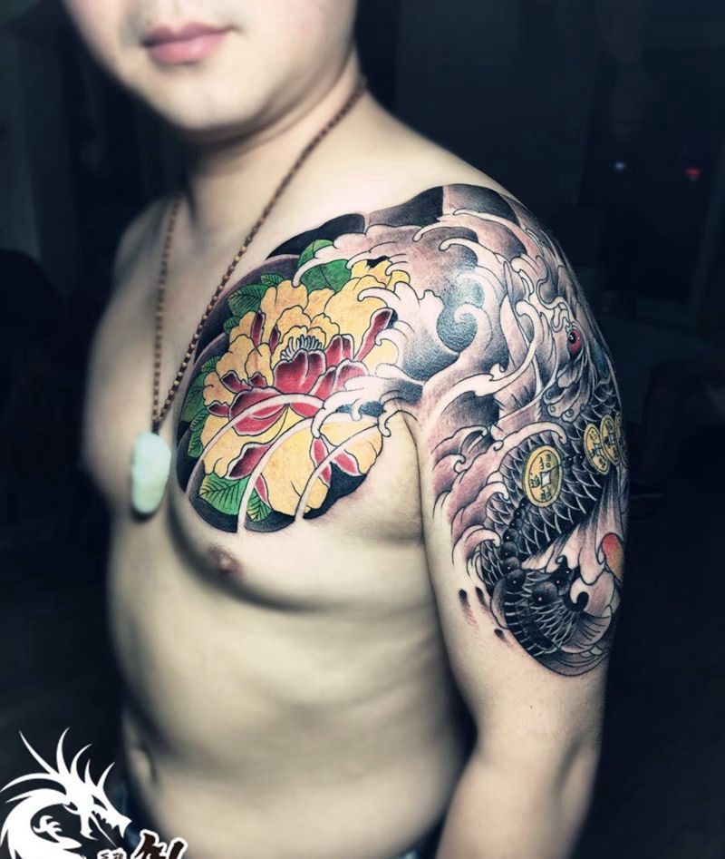 当前位置: 首页 >安徽省亳州市纹身店-鬼谷刺青工作室纹身图案>半甲完工下次续接花臂纹身图片