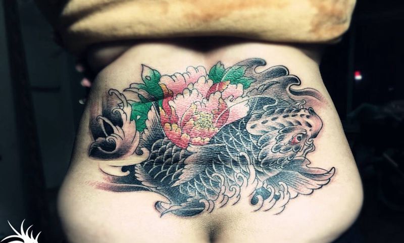 当前位置: 首页 >安徽省亳州市纹身店-鬼谷刺青工作室纹身图案>小腿般若腰部鲤鱼纹身图片