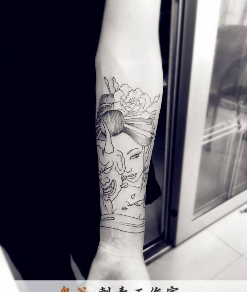 当前位置: 首页 >安徽省亳州市纹身店-鬼谷刺青工作室纹身图案>艺妓线条纹身图片
