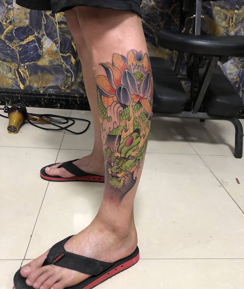 • T网红王老大花腿龙纹身图片_腿部新传统纹身图案
