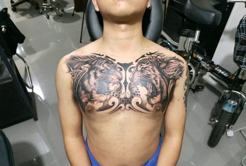 老虎花胸纹身图片_胸部欧美写实纹身图案