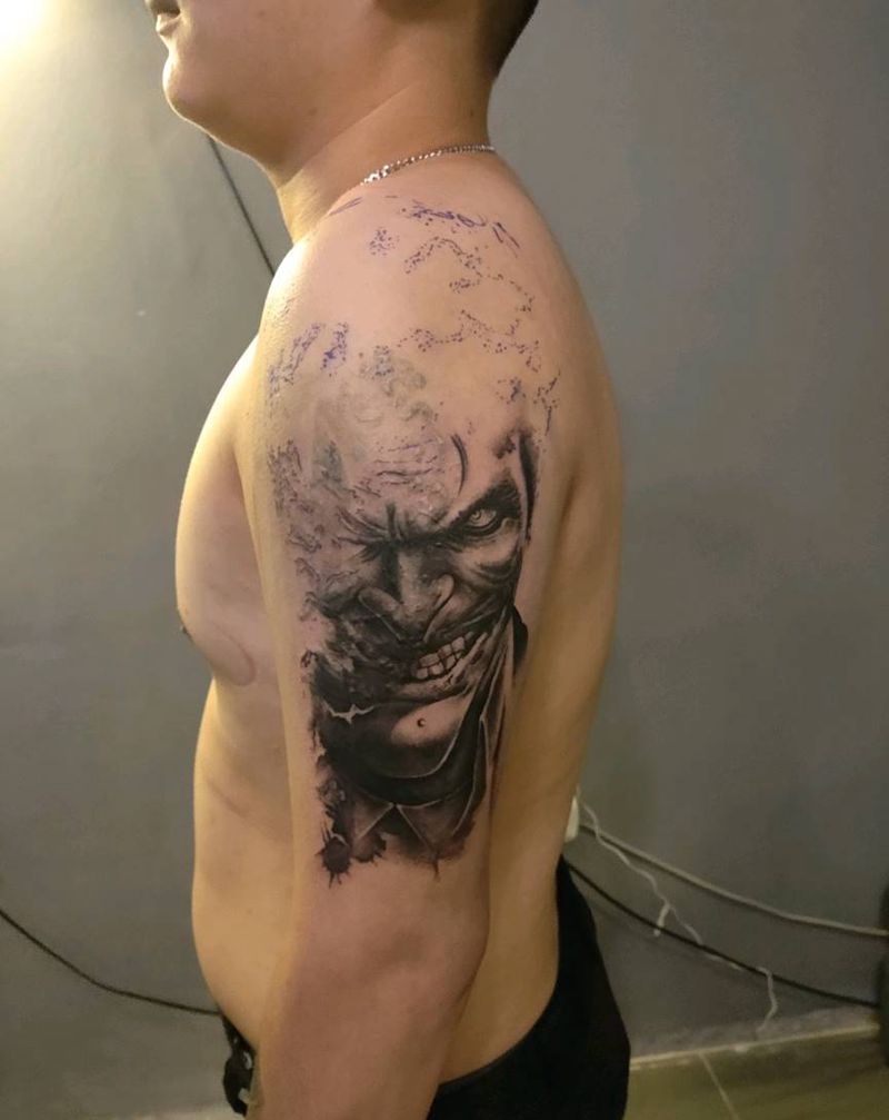 当前位置: 首页 >福建省福州市纹身店-卓刺青纹身图案>小丑盖疤纹身图片_手臂欧美写实纹身图案