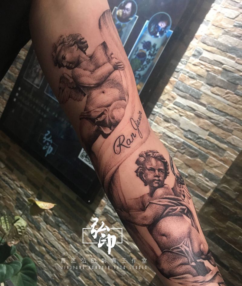 当前位置: 首页 >福建省福州市纹身店-弘印刺青(万象店)纹身图案>小天使纹身图片_手臂欧美写实点刺纹身图案
