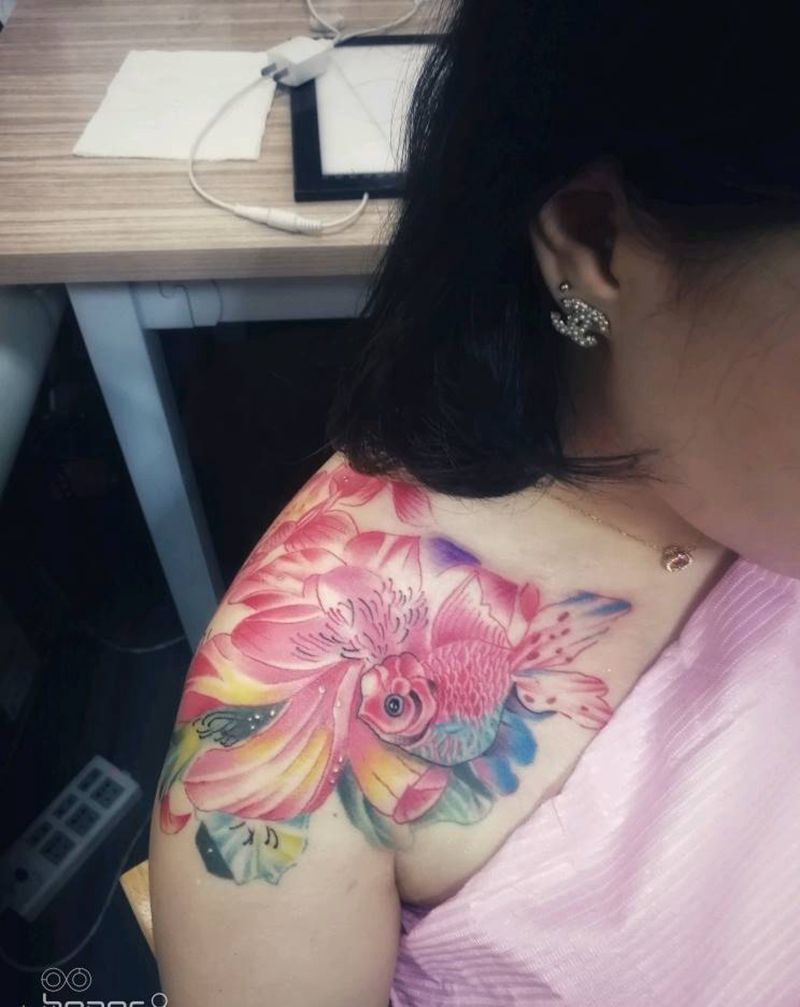 肩膀水彩小金鱼纹身图片_肩部水彩金鱼 荷花纹身图案