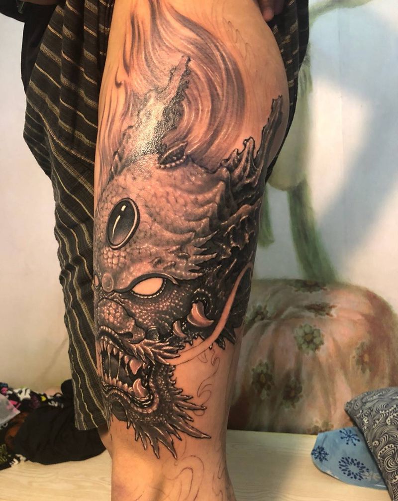 • T网红王老大花腿龙纹身图片_腿部新传统纹身图案
