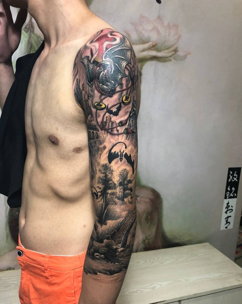 当前位置: 首页 >福建省福州市纹身店-福建纹铭刺青纹身图案>旧图衔接山水七分臂纹身图片