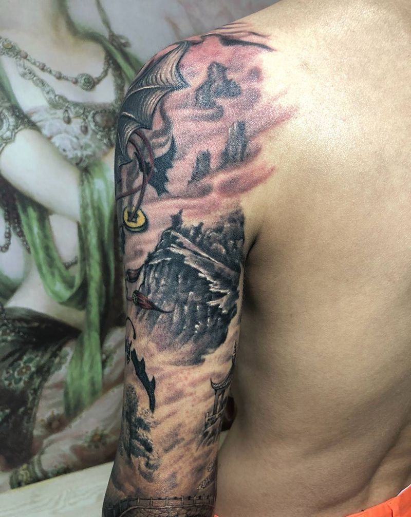 当前位置: 首页 >福建省福州市纹身店-福建纹铭刺青纹身图案>旧图衔接山水七分臂纹身图片