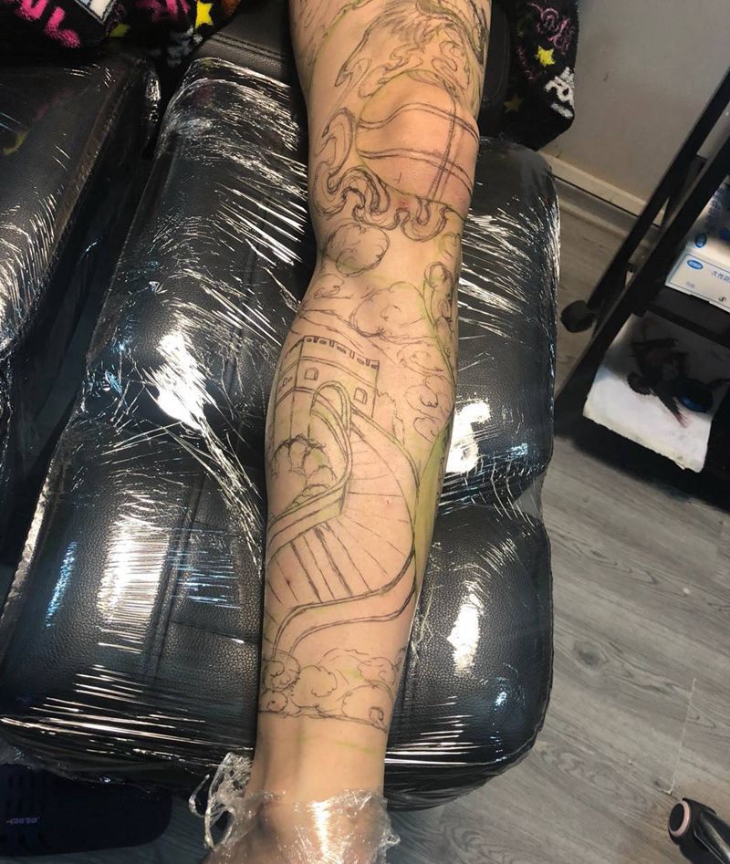 • T网红王老大花腿龙纹身图片_腿部新传统纹身图案