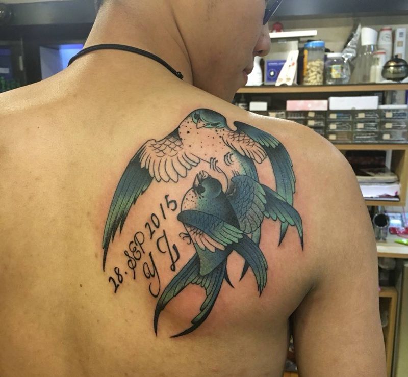 当前位置: 首页 >福建省福州市纹身店-福建纹铭刺青纹身图案>欧School燕子纹身图片_成品插画肩部背部欧美清新动物纹身图案