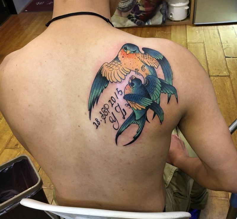 当前位置: 首页 >福建省福州市纹身店-福建纹铭刺青纹身图案>欧School燕子纹身图片_成品插画肩部背部欧美清新动物纹身图案