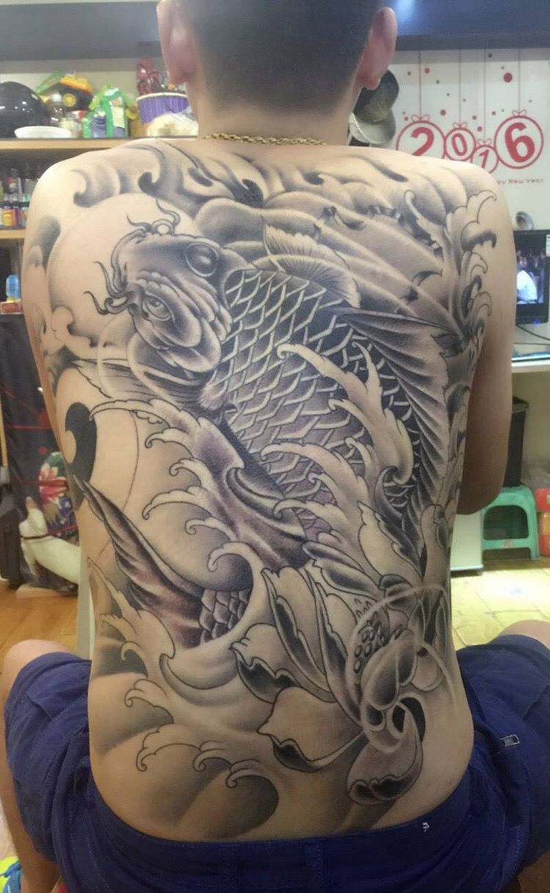 满背鲤鱼纹身图片_成品肩部腰部背部传统图腾纹身图案