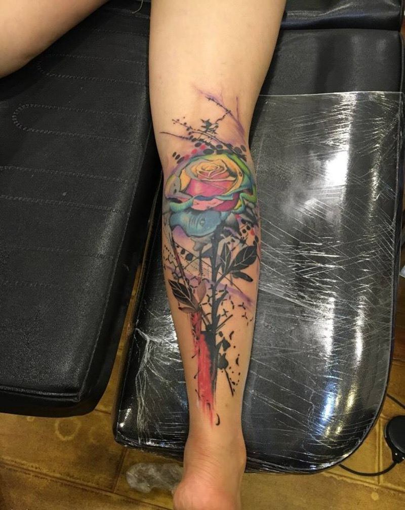欧School玫瑰纹身图片_成品腿部欧美植物纹身图案
