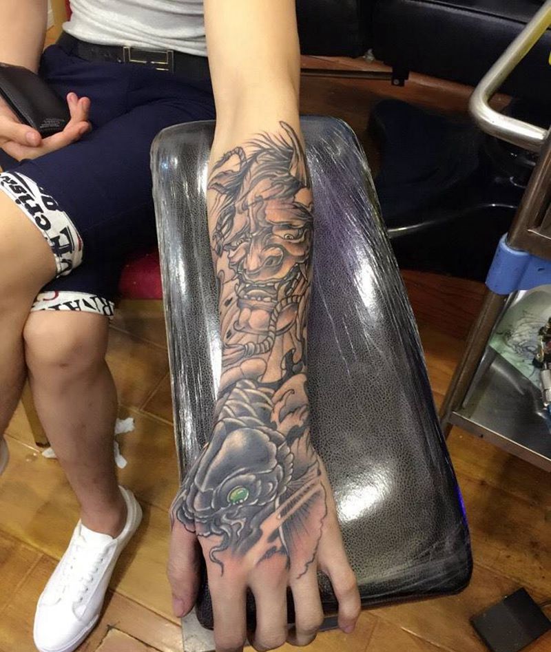 当前位置: 首页 >福建省福州市纹身店-福建纹铭刺青纹身图案>般若鲤鱼盖疤纹身图片_成品手臂手部传统人物鬼神纹身图案