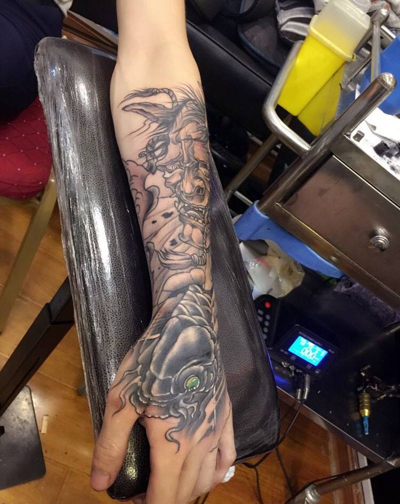 当前位置: 首页 >福建省福州市纹身店-福建纹铭刺青纹身图案>般若鲤鱼盖疤纹身图片_成品手臂手部传统人物鬼神纹身图案
