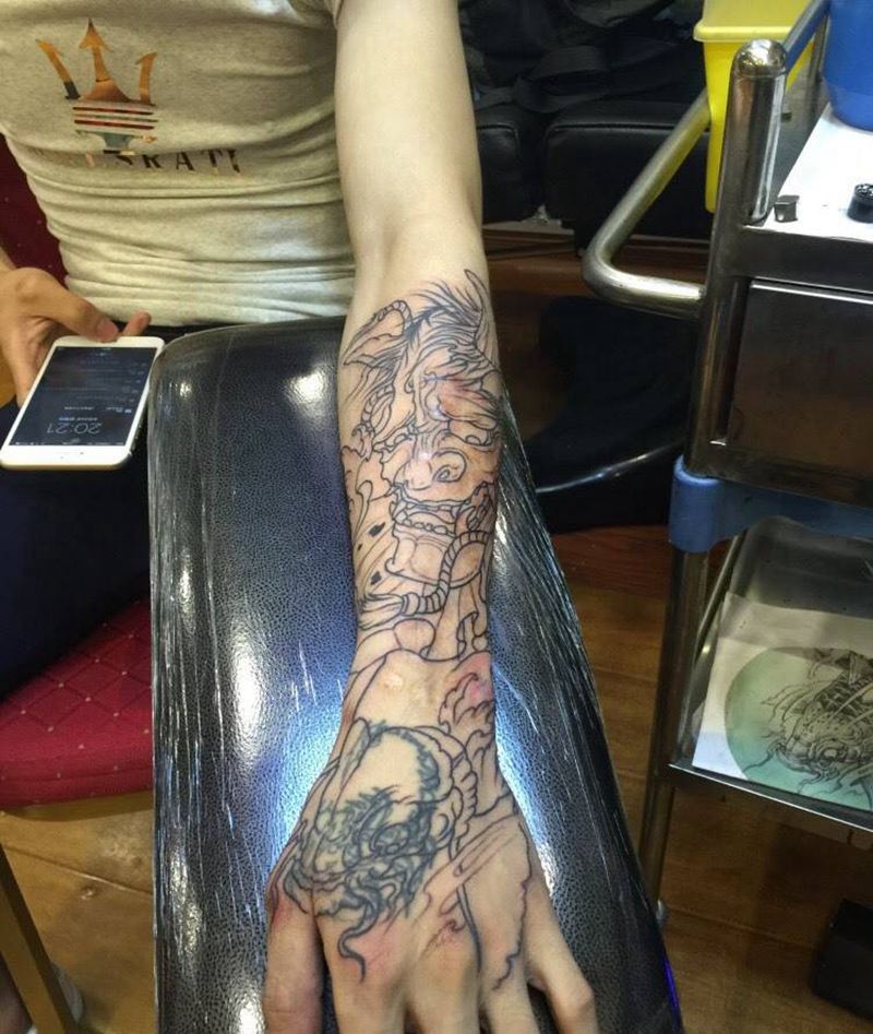 当前位置: 首页 >福建省福州市纹身店-福建纹铭刺青纹身图案>般若鲤鱼盖疤纹身图片_成品手臂手部传统人物鬼神纹身图案