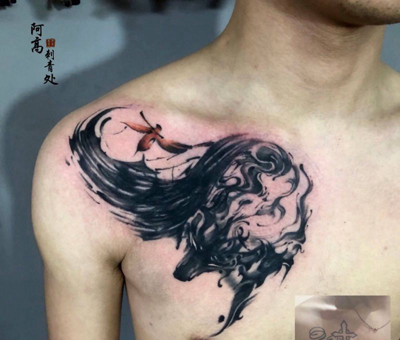 水墨狼遮盖纹身图片_胸部水墨纹身图案