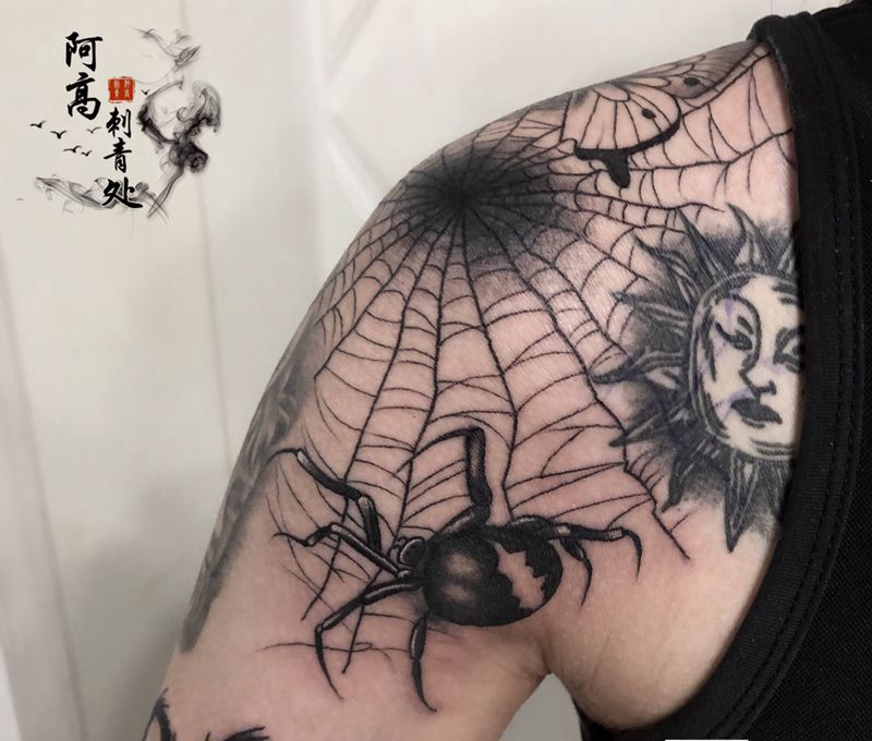 当前位置: 首页 >福建省福州市纹身店-阿高刺青处纹身图案>暗黑风格蜘蛛网纹身纹身图片_肩部几何New School纹身图案
