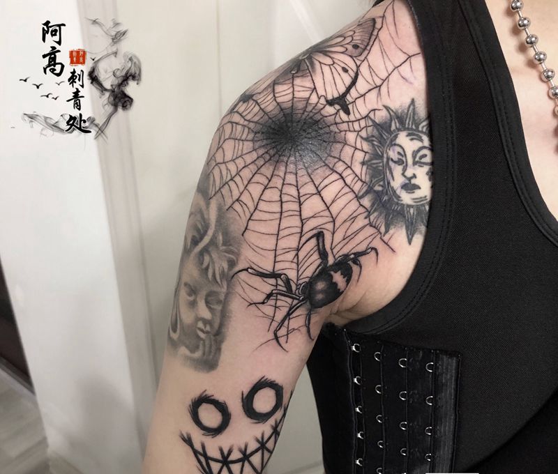 当前位置: 首页 >福建省福州市纹身店-阿高刺青处纹身图案>暗黑风格蜘蛛网纹身纹身图片_肩部几何New School纹身图案