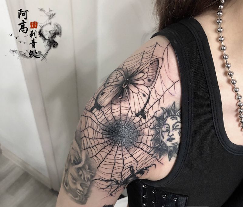 当前位置: 首页 >福建省福州市纹身店-阿高刺青处纹身图案>暗黑风格蜘蛛网纹身纹身图片_肩部几何New School纹身图案