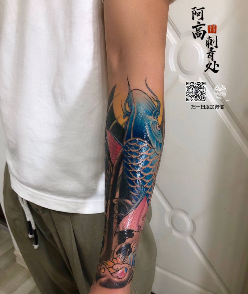 当前位置: 首页 >福建省福州市纹身店-阿高刺青处纹身图案>遮盖彩色鲤鱼纹身图片_手臂新传统纹身图案