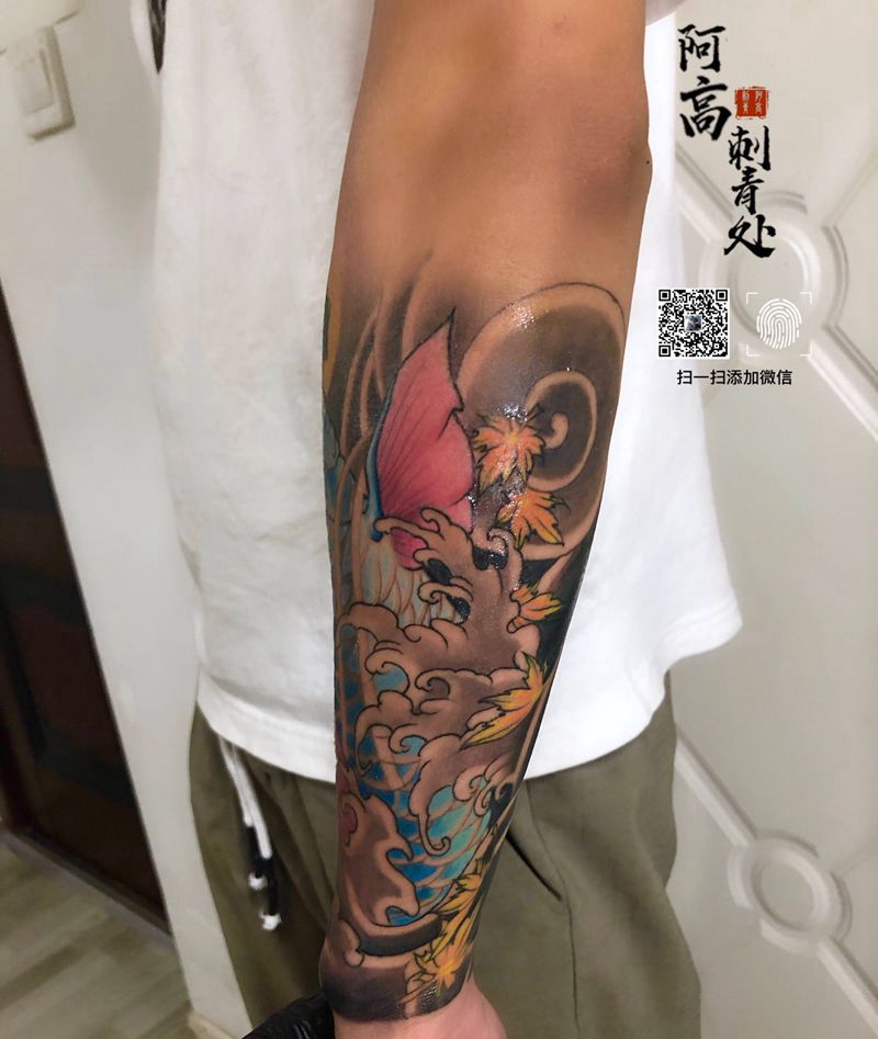当前位置: 首页 >福建省福州市纹身店-阿高刺青处纹身图案>遮盖彩色鲤鱼纹身图片_手臂新传统纹身图案