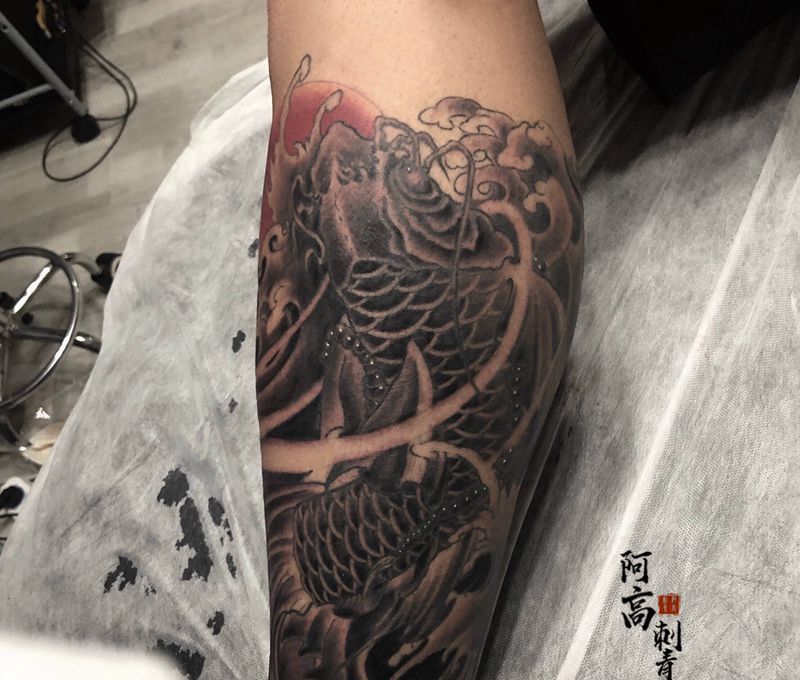 当前位置: 首页 >福建省福州市纹身店-阿高刺青处纹身图案>鲤鱼浪花包小腿纹身图片_腿部新传统纹身图案