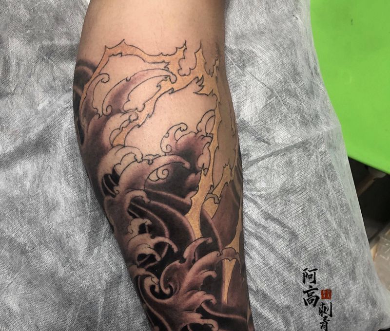 当前位置: 首页 >福建省福州市纹身店-阿高刺青处纹身图案>鲤鱼浪花包小腿纹身图片_腿部新传统纹身图案