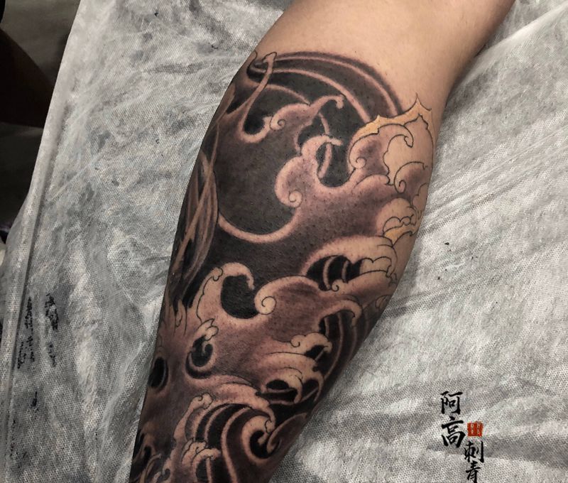 当前位置: 首页 >福建省福州市纹身店-阿高刺青处纹身图案>鲤鱼浪花包小腿纹身图片_腿部新传统纹身图案