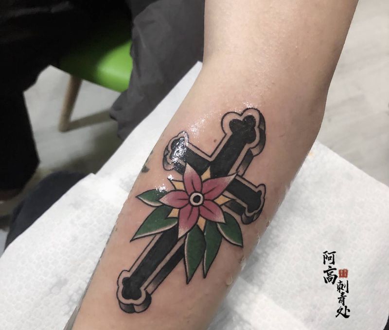 当前位置: 首页 >福建省福州市纹身店-阿高刺青处纹身图案>十字架纹身图片_手臂Old School纹身图案