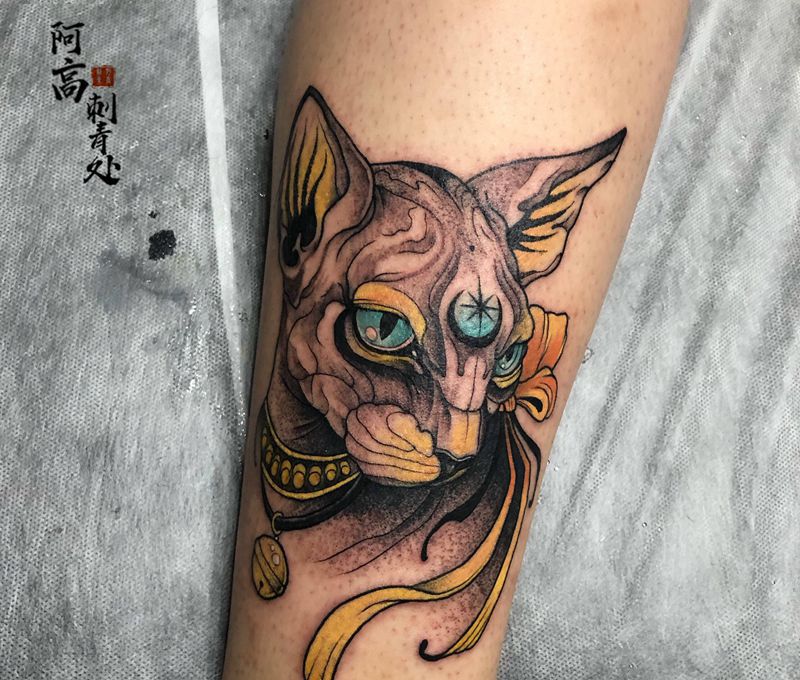 当前位置: 首页 >福建省福州市纹身店-阿高刺青处纹身图案>斯芬克斯无毛猫纹身图片_腿部New School纹身图案