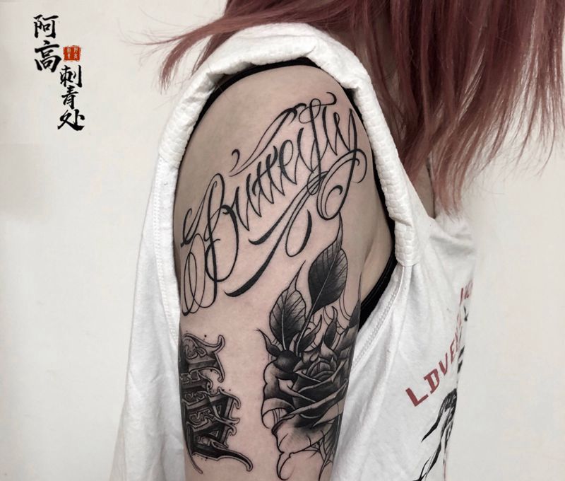 当前位置: 首页 >福建省福州市纹身店-阿高刺青处纹身图案>拼接纹身图片_手臂花体字New School纹身图案