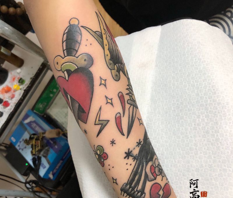 当前位置: 首页 >福建省福州市纹身店-阿高刺青处纹身图案>拼接纹身图片_手臂Old School纹身图案
