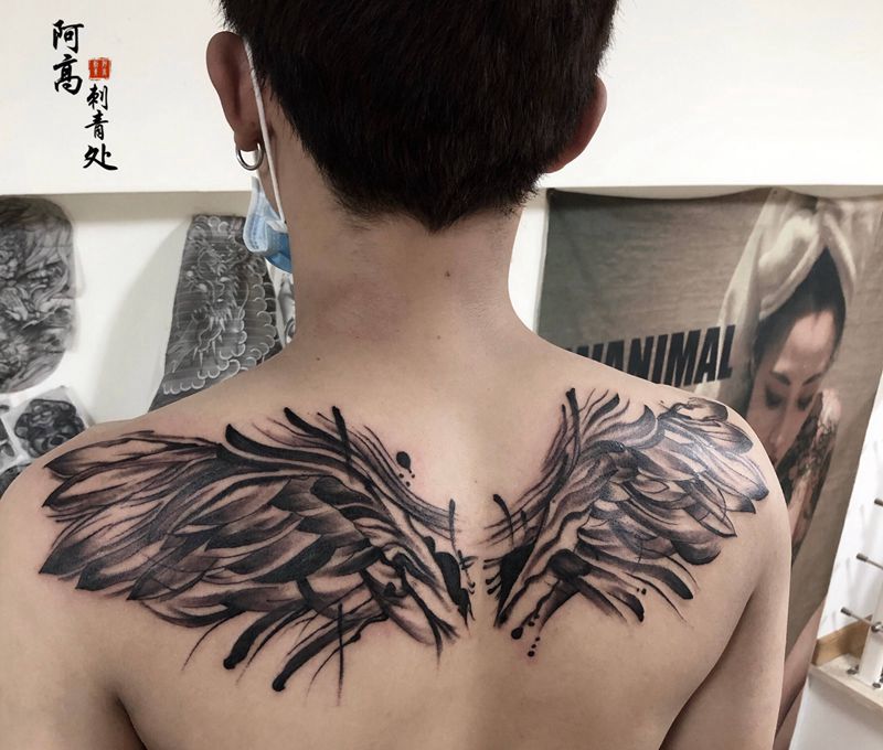 当前位置: 首页 >福建省福州市纹身店-阿高刺青处纹身图案>水墨翅膀纹身图片_肩部背部水墨纹身图案