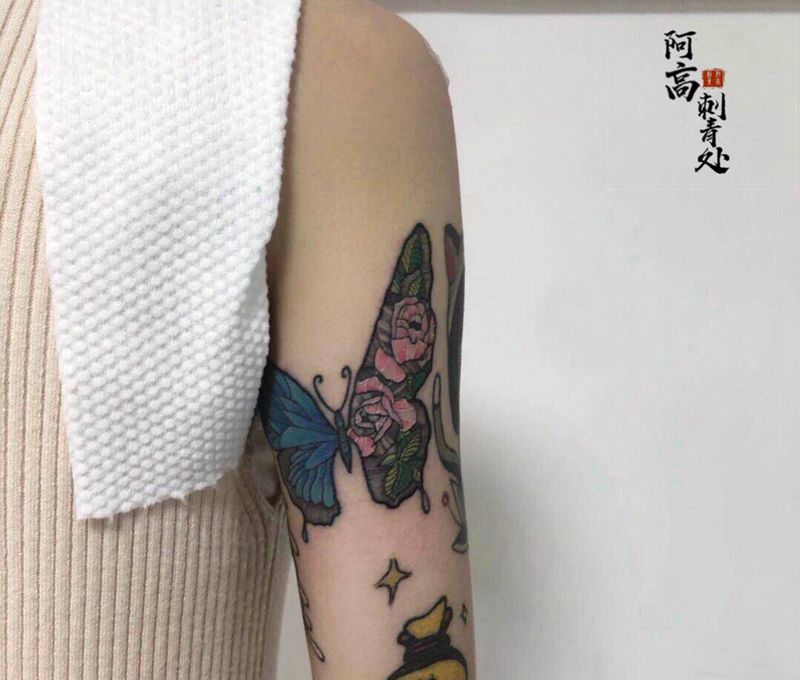 当前位置: 首页 >福建省福州市纹身店-阿高刺青处纹身图案>蝴蝶纹身图片_手臂Old School纹身图案