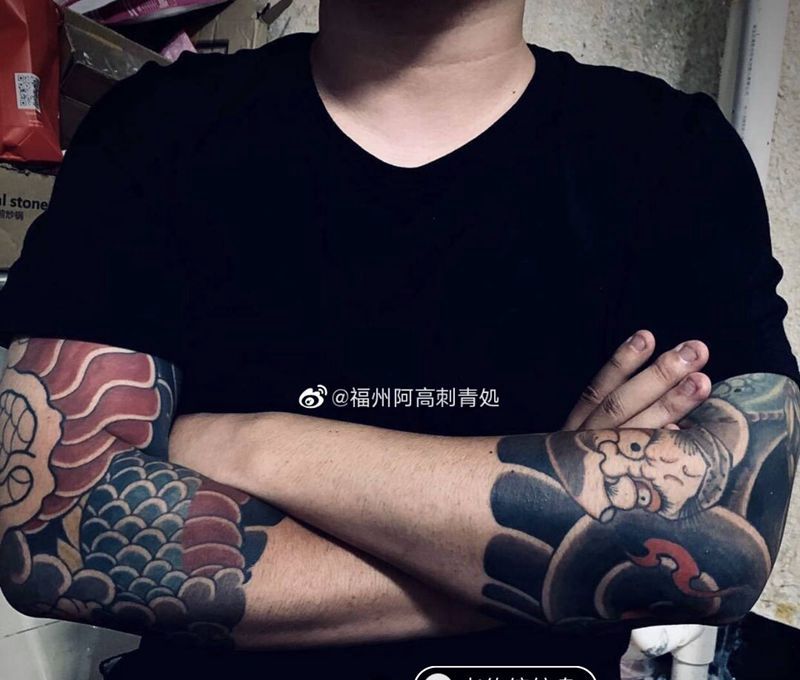 当前位置: 首页 >福建省福州市纹身店-阿高刺青处纹身图案>老传统七分袖纹身图片_手臂老传统纹身图案